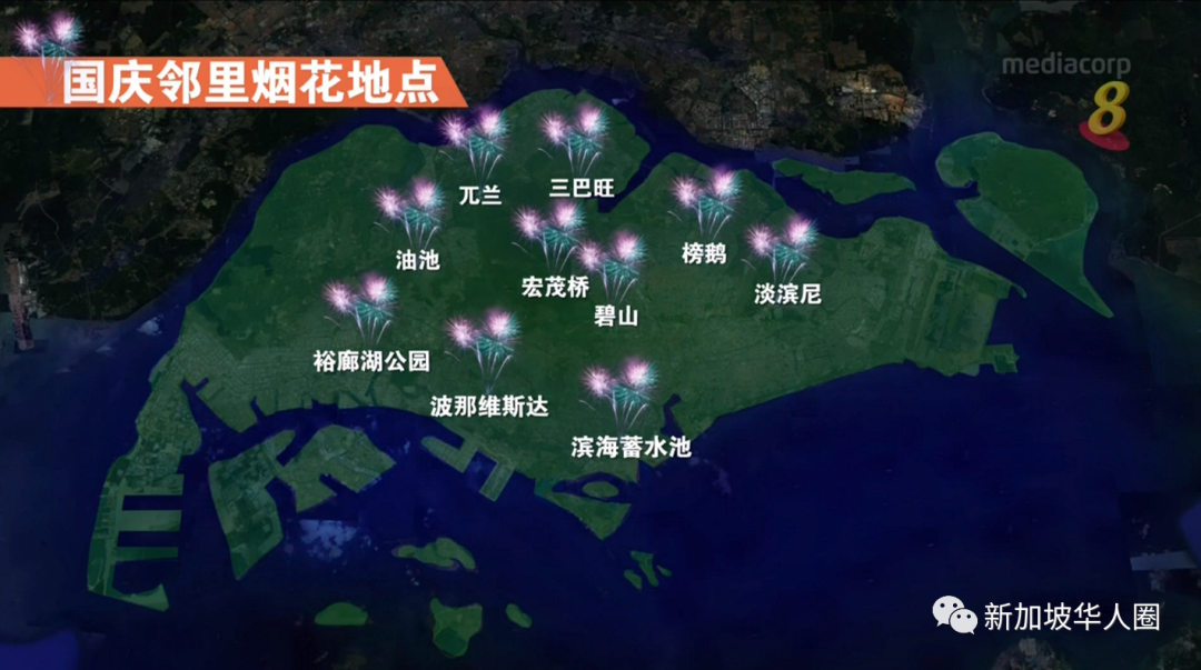 新加坡政府为庆祝今年的国庆日,当晚唱国歌以及宣读信约后,新加坡今年将分散10个地点进行国庆燃放,大约8点20分全岛10个地点同时燃放烟花长约五分钟,上述10个地点包括裕廊湖花园(Jurong Lake Gardens)、滨海蓄水池(Marina Reservoir)、宏茂桥、碧山、波那维斯达、榜鹅、三巴旺、淡滨尼、兀兰和油池,为避免人潮聚集,鼓励大众在家观礼。