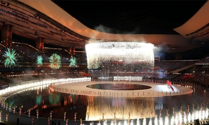 开幕式上的烟花兼具艺术美与科技味,成为一大亮点。文艺演出开场前,一场虚实相生、颇具创意的电子“烟花秀”率先上演,场地上空的环形烟花装置同步启动,点点金光从天而降,绚烂夺目又仙气飘飘,其中那朵硕大醒目的“花朵”——素有“南国英雄树,广州第一花”之美誉的木棉花造型烟花,便是虚拟呈现的惊艳之作。而传统烟花秀环节同样精彩,绚烂烟花点亮夜空,最后一幕的璀璨景致定格成无数人心中的难忘记忆。