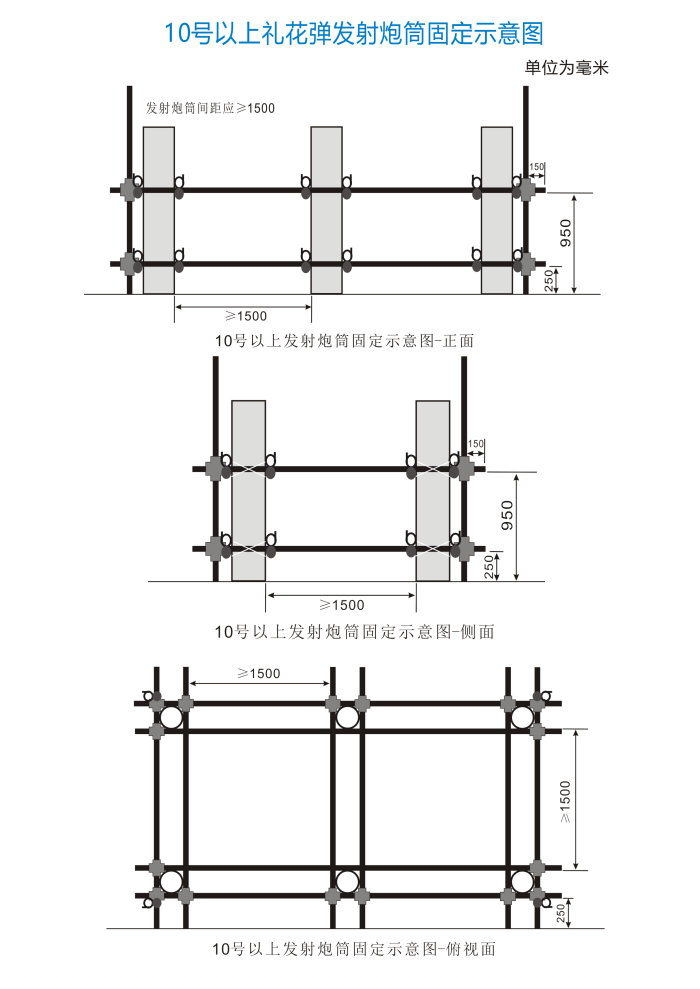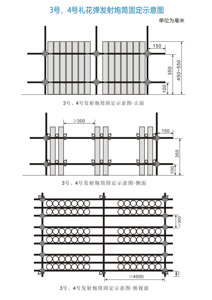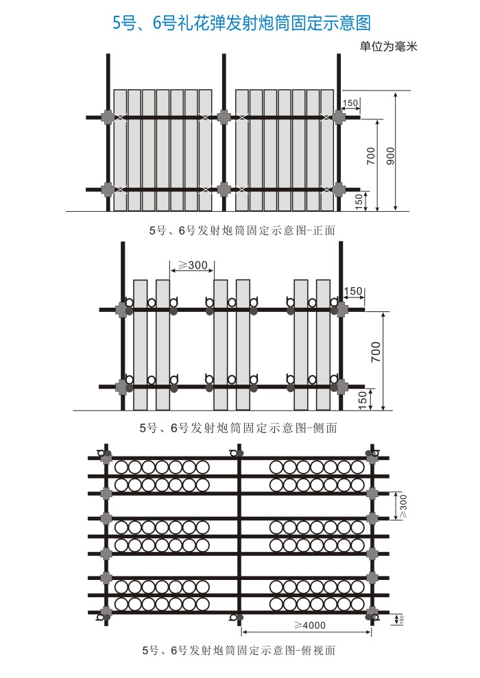 4. 发射炮筒安装完毕后、装填前,现场负责人、技术人员、安全员应逐个进行检查验收,检查内容包括发射炮筒和架子的稳定性、角度、发射炮筒间距等。